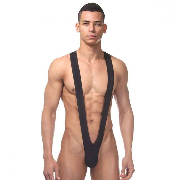 Очень открытое черное боди для мужчин из хорошо тянущейся ткани, на широких лямках.