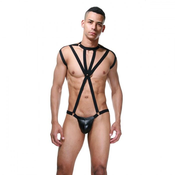 Невероятное боди, из гладкой блестящей черной ткани. Абсолютно открытые ягодицы, соблазнительное переплетение ремней на груди и плечах, застежка на шее сзади.