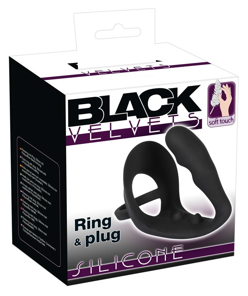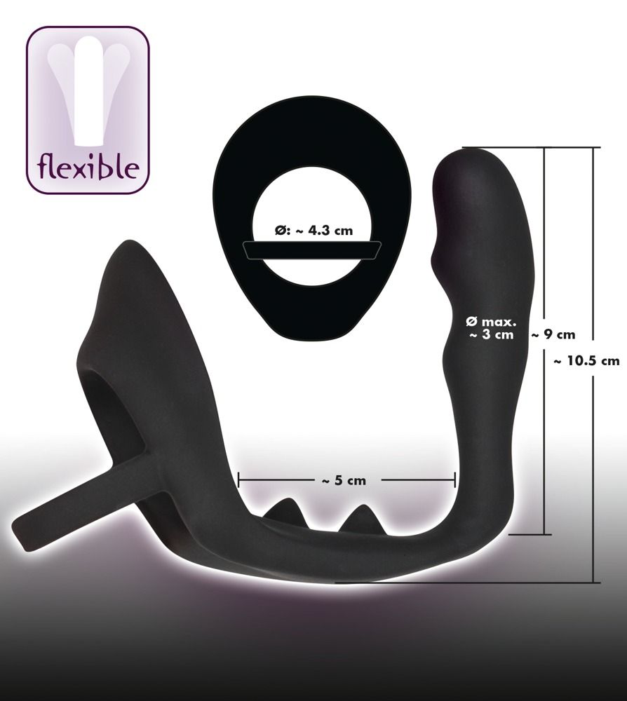 Эрекционное кольцо с подхватом мошонки и анальным отростком для воздействия на простату. Гибкое, выполнено из силикона. Длина перемычки - 5 см. Длина анального стимулятора - 9 см., диаметр - 3 см. Диаметр кольца - 4,3 см.