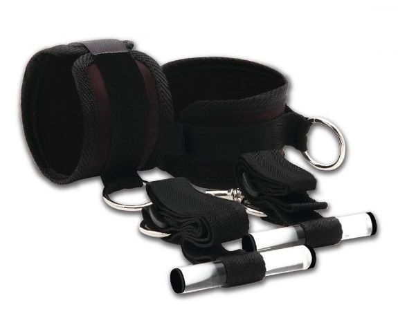 Черные наручники из мягкого поролона, размер регулируется на липучках. Манжеты можно использовать отдельно или вместе со стропами, которые можно закрепить на двери. Прозрачные цилиндрики перебрасываются через дверь, она закрывается и Ваш пленник вынужден держать руки вертикально.