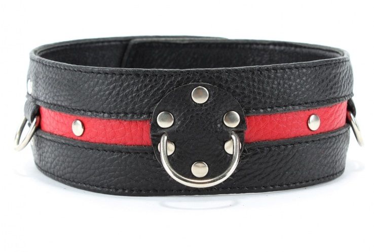 Черно-красный кожаный ошейник увеличенного размера с кольцом.